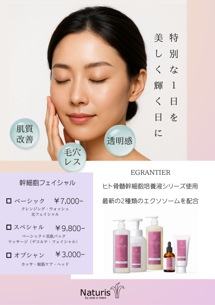 新たにエステティシャンの玉井美子を迎え入れ、ヒト幹細胞フェイシャルエステを始めます。
